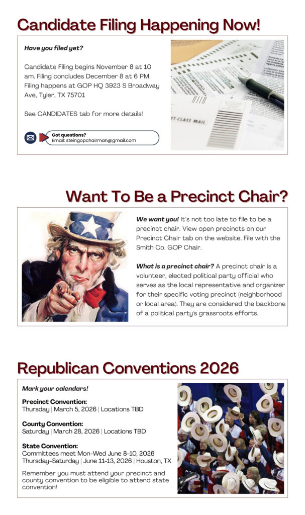 Email lists property of Smith County GOP & Chair not to be used by any other organization or distribution.