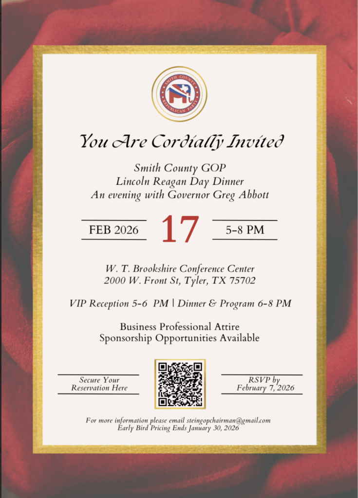 We invite all of Smith County and neighboring communities to be part of this special evening as we celebrate Republican values and hear from our state’s leader.